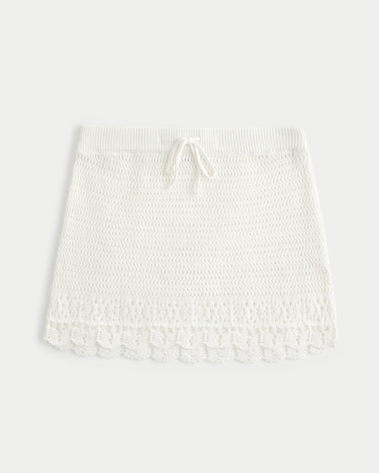 A soft, 100% cotton swim cover-up skirt featuring a delicate crochet-inspired stitch. Scalloped hem with a comfortable drawstring waist.