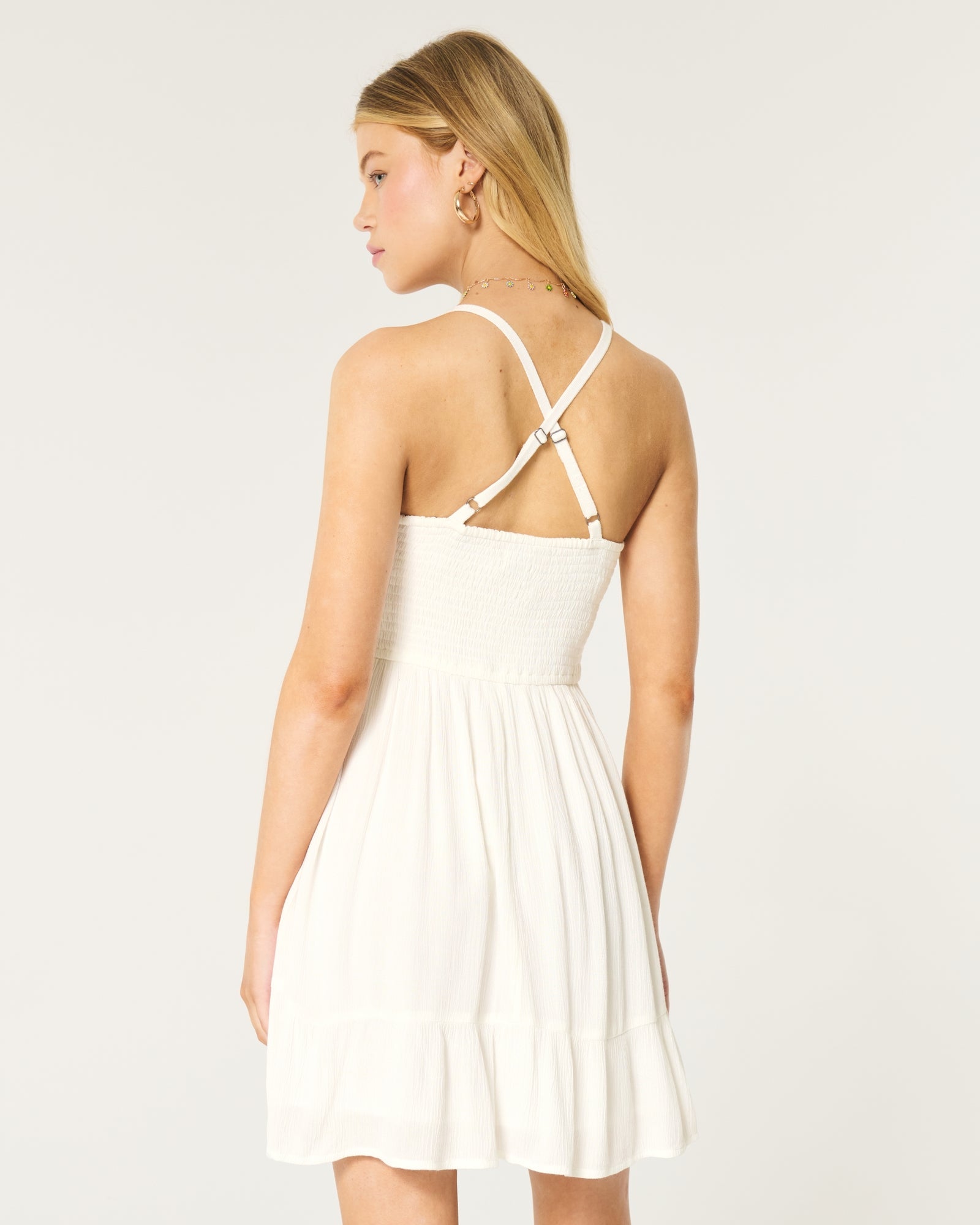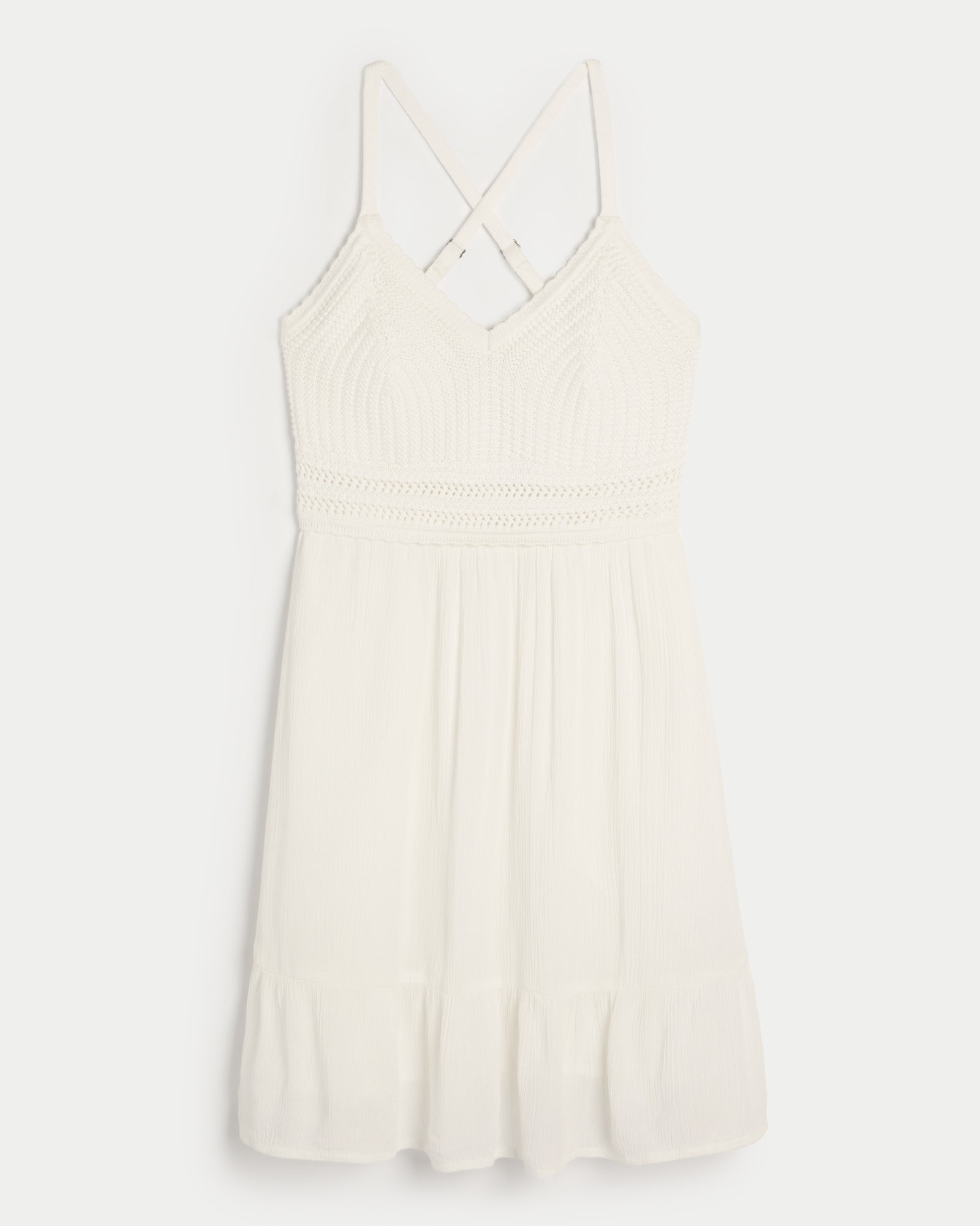 This charming mini dress boasts a blend of crochet-like fabric and woven textures for a unique look and feel. Its adjustable straps and practical pockets enhance comfort and style. Featuring a V-neckline, this dress is both feminine and effortless.