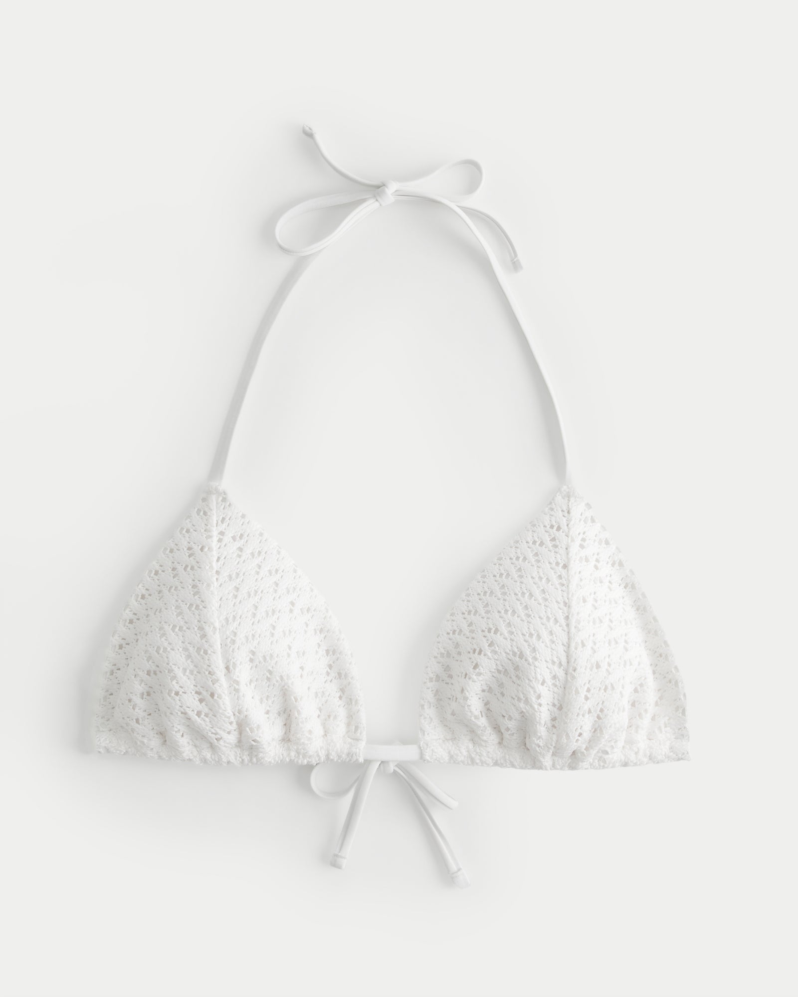 This effortlessly chic bikini top boasts a timeless triangle shape. Crafted from soft, crochet-inspired swimwear fabric, it features adjustable tie straps for a customized fit. Removable pads offer added support and shape.