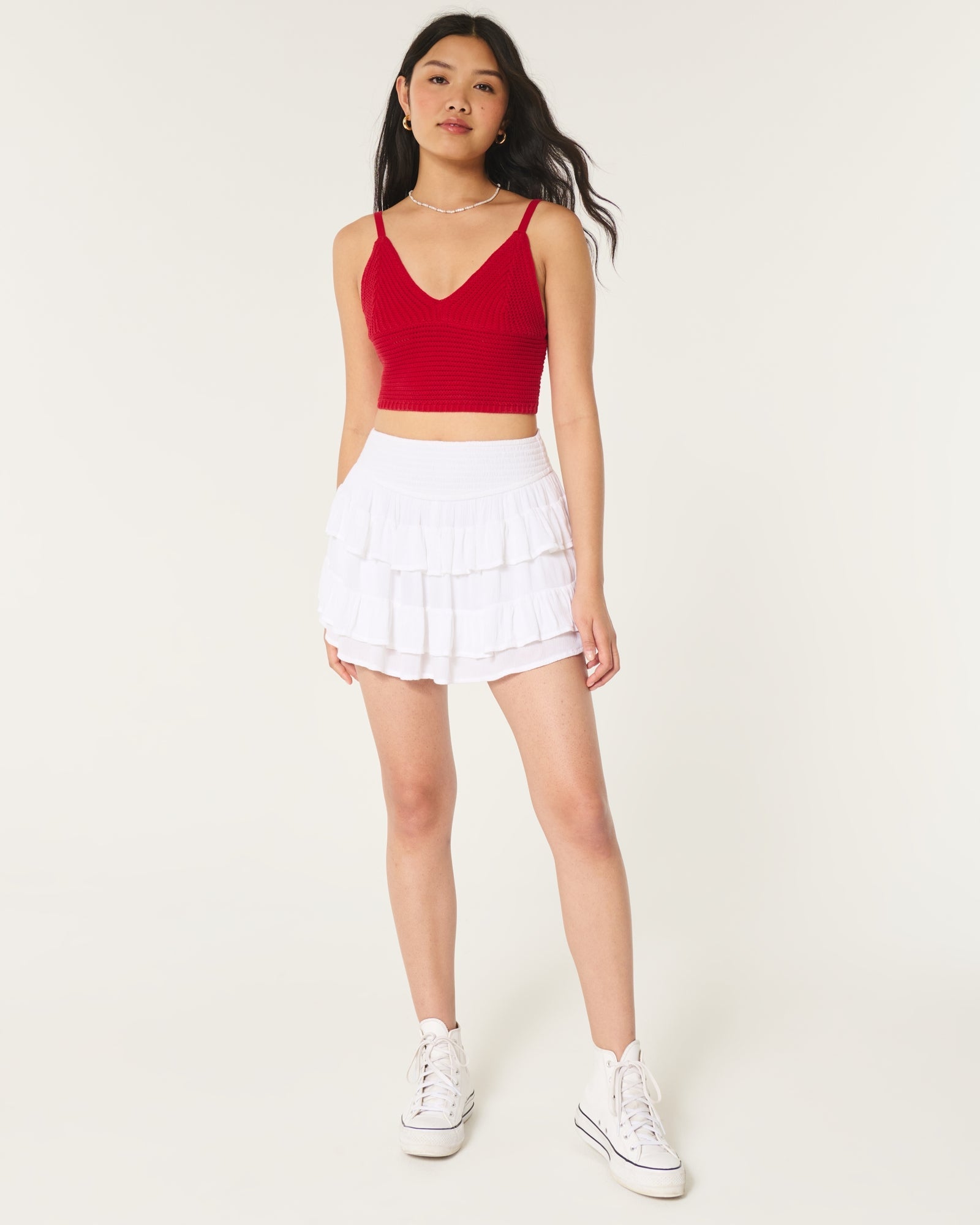 A soft bralette made from comfy crochet-style fabric, with built-in lining for comfort and support. Features adjustable straps, cropped length, and v-neckline. Slim fit.